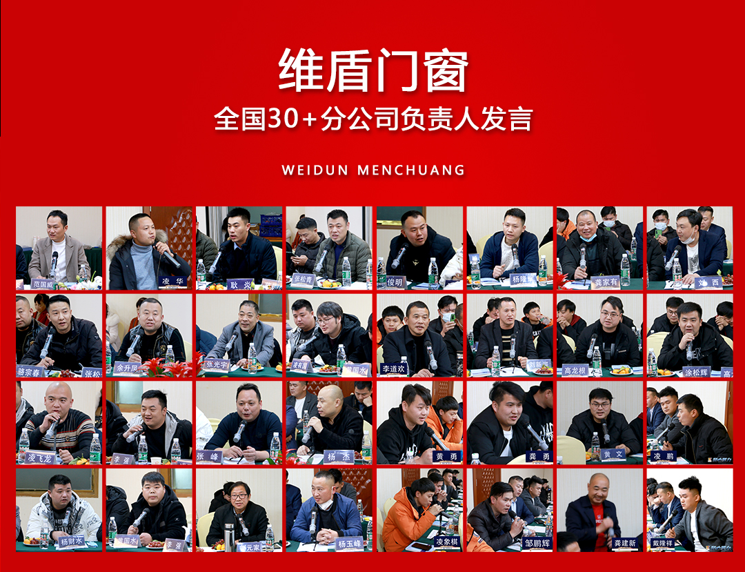 會議研討環(huán)節(jié)中,蘇州、太原、西安、寧波負(fù)責(zé)人分享了他們對于門窗市場的分析和在市場運營中的創(chuàng)新舉措與成功經(jīng)驗。同時,上海、天津、南京、杭州、蘇州、常州、揚州、泰州、貴陽、石家莊、保定、武漢、南昌、包頭、太原、西安、南通、濟(jì)南、青島、東營、寧波、深圳、成都、臺州、海口、鎮(zhèn)江、貴陽、鹽城、李道歡、烏魯木齊、呼和浩特分公司負(fù)責(zé)人暢所欲言,會上就七天交貨、每年推出3款產(chǎn)品、專注目標(biāo)人群做好口碑、供應(yīng)鏈升級、打造高品質(zhì)產(chǎn)品、全力幫扶專賣店等問題進(jìn)行了深刻的探討交流,大家積極發(fā)言,共同為維盾發(fā)展,獻(xiàn)計獻(xiàn)策。