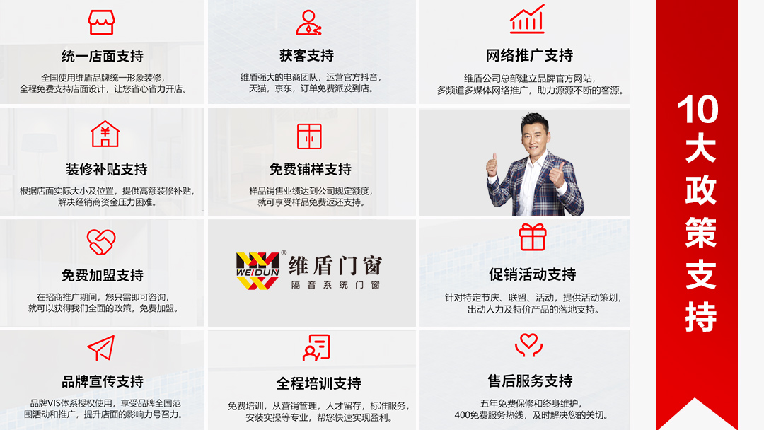 為加盟商賦能,助力終端門店快速成長。政策力度空前,加盟維盾門窗,好前景,高毛利,強強聯合搶占藍海紅利!